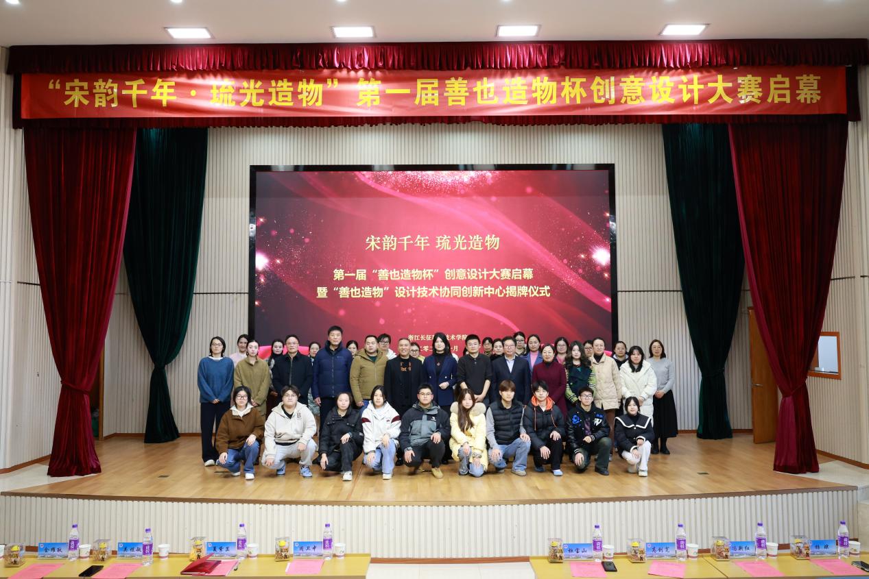 1月7日,“宋韵千年・琉光造物”第一届善也造物杯创意设计大赛暨“善也造物”设计技术协同创新中心揭牌仪式在浙江长征职业技术学院第二报告厅隆重举行。浙江省文化创意产业协会秘书长周卫中,浙江省非物质文化遗产保护协会理事、杭州善也文化创意有限公司负责人夏紫菡,浙江省陶瓷行业协会副主席吴煜敏,浙江省书法家协会理事金耀耿,浙江省知识产权成果转化专家方红军,浙江长征职业技术学院副校长杜宝山、高创宽、冯新红及相关师生代表齐聚一堂,共同见证这一意义非凡的时刻。